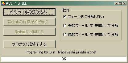 さて、今回やったことを結論から言えば(*)、AVIファイルをフィールド毎に分解してBitmapファイルに落とすプログラムを作ったのだ。「このソフトはとても便利だ」と言ってくれる人がいたならば、感謝感激雨あられだ。とりあえず、私には欠かすのことのできないソフトである。なぜ、このソフトがそんなに便利なのかを、これから手短に(**)語りたい。