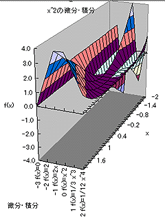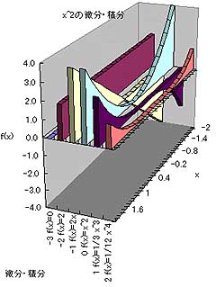 まずは、イメージを考えるためにグラフを作成してみる。x^2の関数、および、それを微分・積分した関数である。微分は3階まで、積分は2階まで行っている。