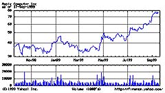 一見似ているように思える。しかし、よく見てみると軸が違っている。左のAppleComputerの株価変動は対数軸で表されている。「株価表示グラフで値の軸を対数軸にできないか」という言葉が頭にあったせいで気づいたわけだ。そこで、この違いが新鮮で「今日の必ずトクする一言」のwebmaster氏への返信に至ったわけである。