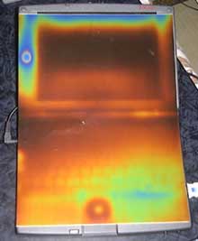 さて、それでは感温液晶を使っていくつか測定を行ってみたい。まずは、NotePCの発熱分布を調べてみる。最近のNotePCはかなり熱くなるものが多い。暖かいというよりもアッチッチ状態になるものさえある。
