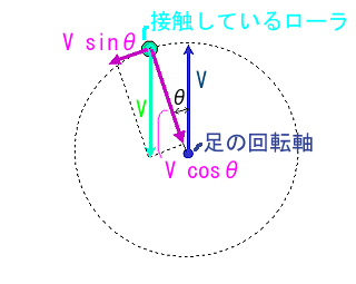 それでは、簡単な力学計算をしてみる。「足の回転軸」と「地面に接触しているローラ部分」を拘束系の剛体問題と考えてみよう。インラインスケートのローラは「足の回転軸」と「地面に接触しているローラ部分」を結ぶ方向にはいくらでも回転できる。したがって、転がり摩擦を無視すれば、その方向に関しては「地面に接触しているローラ部分」は地面からは何の力も受けない。しかし、ローラは「足の回転軸」と「地面に接触しているローラ部分」を結ぶ方向と直行する方向には回転することができない。したがって、その方向へ地面から力を受けることになる。滑っている人の速度をVとすれば、「地面に接触しているローラ部分」が「足の回転軸」と「地面に接触しているローラ部分」を結ぶ方向と直行する方向に受ける力はVsinθである(シータは文字化けしそう...)。