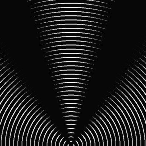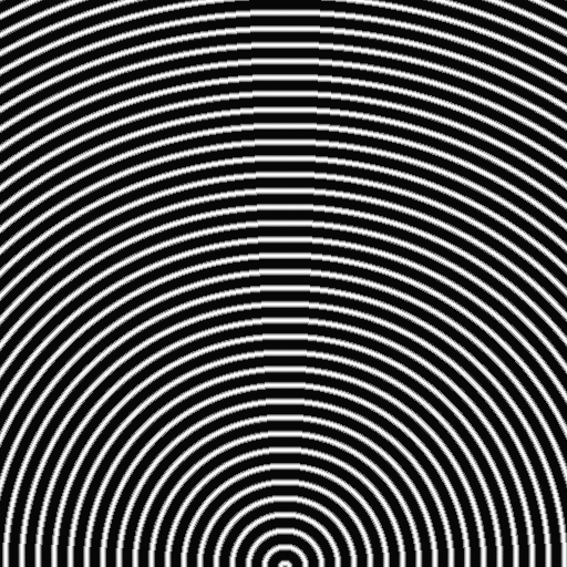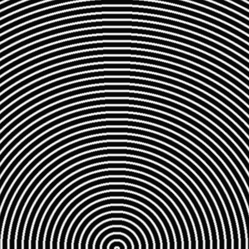 まず、以下のような2つの同心円画像をつくる。(なお、このような画像を簡単に作るために、Photoshop用のフィルターを作った。詳しくは「Photoshopの同心円フィルターを作る。」を参照して頂きたい。)以下の2つの画像は少し中心位置がずれている。また白く見えるところは255の値を持ち、黒く見えるところは0の値を持っている。(画像自体は512x512であり、表示の際に128x128に変換している。だから、この画像をそのまま保存して頂ければ、512x512のサイズで保存することができる。)