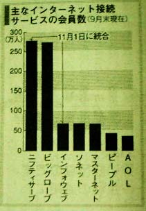 今回は、朝日新聞の10月20日の「インターネット接続サービスの会員数」というグラフに関して調べてみたい。この記事は富士通系のniftyとInfoWebが一体化することに伴い、インターネット接続サービスがどう変化していくか、ということに関する記事である。