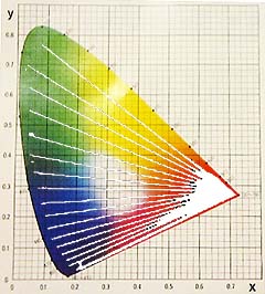 なお、上の図中で中心部が暗くなっているが、それはグリッド線のためであり、本来の色はもっと白っぽい色である。また、今回は岡島修氏の「レーザポインタと色覚異常」中の図と比較するために、CIExy色度図を用いたが、もともとxy色度図は人間の感じ方とは結びつけにくい。いずれ、均等色空間における解析を行うつもりである。また、先に記述したようにきちんと錐体の波長感度特性を考慮に入れた計算をするつもりである。今回はあくまでごく簡単な実験である。