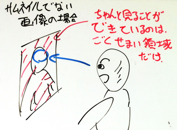 つまり、大きな画像を眺める時には、眺めている箇所はクッキリ見えていても、それ以外の箇所はボンヤリとしか見えていない、というわけです。