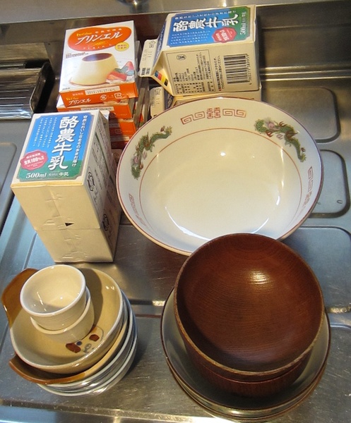 まずは、ローソン100円ショップに行き、「プリンの素」を何個も、そして「酪農牛乳」を何本も買ってきます。