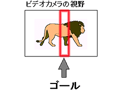 この競馬の着順判定写真の場合、カメラは空間に固定され「時間軸に変化するもの」を撮影していた。だから、このように各画像から一部を抽出して並べると、それは「時間軸」に対する変化を示すものを得ることができる。