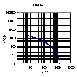 それでは、日記猿人とReadMe!JAPANの得票ランキングの例を示してみる。横軸はランク(順位)であり、縦軸が得票数である。ここでは縦軸・横軸共に線形軸を用いている。