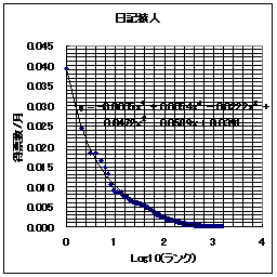 ここで、横軸はランクのLog_10を用いている。本来、ランク(順位)も何らかの正規化の変換をすべきであろうが、今回はやり忘れた。きっと、頭が疲れているせいである。