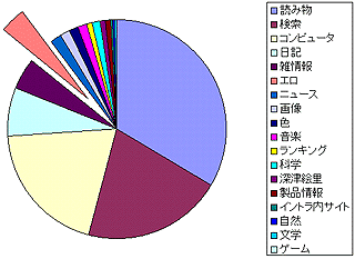 この円グラフから引っ張った部分は「エロ」である。これは、「IO = アイオー」ではない。「エロ= えろ=すけべぇ」である(前にも書いたけど)。 かように、「エロ」に興味を持つ人は多い。例を挙げるならば、「オッパイ星人」という言葉があるくらい、男の中には女性の胸に興味を持つ人が多い。私の友人の中には、ことあるごとに「おぉっ!!」と言いながら、通り過ぎる女性の胸を眺めるような輩までいるのである。しかもメガネをポケットからすばやく取り出し、サッとメガネをかけながら眺めるのである。まるで、ウルトラマンのセブンに変身する瞬間のモロボシダンなのである。「ウルトラセブンか、オマエは!」とか「モロボシダンがオッパイ星人に変身してどないすんねん!」と突っ込みたくなるほどである。