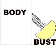 ところで、地表にいる限り、当然バストも重力の影響を受ける。いや、むろん地表でなくても重力の影響は及ぼされるわけだが、そういう話は今回はおいておく。とりあえず、六本木を歩いている彼女も、ロサンゼルスにいる彼女も重力の影響を受けるのである。重力を受ければ、当然バストは重力で引っ張れる方向に垂れ下がってしまう。その様子を示したのが、次の図である。ここでは、「胴体から垂れ下がるバスト」を単純に「重りとバネで表すことができるモデル」だとしてみた。