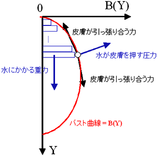 「水風船バストモデル」における内部の水には重力がかかり、バストの下の方にいくほど圧力がかかっている。そして、皮膚に面している内部の水はその圧力を皮膚に伝える。そして、皮膚はその圧力で変形しながら水で満ちたバストを支えるのである。この時、バストの形状= 皮膚の形状を示すバスト曲線はどんな条件を満たしているだろうか?