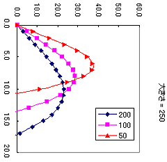 さて、このバスト曲線方程式を一般化したり、係数をちゃんと計算したり、三次元に拡張したりということはまたいつか行うことにして、まずは適当にこのバスト曲線方程式を数値的に解いてみた。それが、例えば、次の図である。これが、「水風船バストモデル」のバストの形状の一例だ。