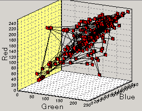 である。いつものように、色々な画像フォーマットの画像を読み込むためにはSusieプラグインが必要である。 これを使って、例えばカラフルフリースで絶好調のWEBサイトwww.uniqlo.comで使われている画像をゴッソリとゲットして、それらの画像をMosaic(ニセモノ)で解析してRGB色空間で眺めてみた結果はこうなる。赤い点がいっぱいあるが、その一点一点が一枚の画像の平均の色味なのである。