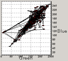 こんな風にしてみてもやはり同じワケわからん状態かもしれないが、もうひとつGreen-Blue平面を眺めてみると何やら面白い様子が見えてくる。