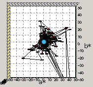 それが端的にわかるのがa*b*平面で表示させてみた場合である。a*方向すなわち赤色方向は多いのに対して、b*の小さい方向つまり緑方向などには妙に点がないことがわかるだろう。今のユニクロは緑を何故か避けているのである。緑の純色のフリースは人気がないのだろうか?う〜ん、不思議なところだ…