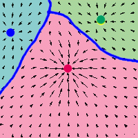 この図に示した山脈では、中央の山が他の山より高いのだが次の「少しでも高い方向」を示した図を見れば判るように、「少しでも高いところへ歩を運べば、やがて最も高い山頂に到達する」わけではない。下の図では青い線で示したような分水嶺が存在して、それぞれの領域の中で「少しでも高いところへ歩を運べば」、その近くの高い部分には到達するが、「やがて最も高い山頂に到達する」わけではない。当たり前である。