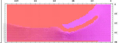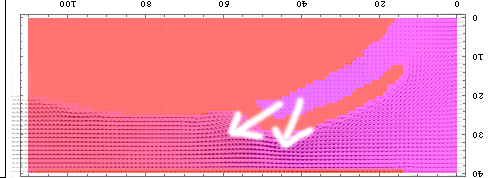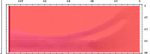 の時と同じく、Nast2Dを適当に改造して簡単に解析を行ってみた。今回はReynolds数は100で計算してみたが、次に計算するときにはReynolds数の妥当な値を考慮してやってみたいと思う。残念ながら、今回は本当に適当に計算をしてみただけである。まぁ、最初の試しだからそんなものだ。 まずは「前垂れがなくて、水着の中に入った水の逃げ場がない場合」の水流の速度分布の計算結果を下に示してみよう。