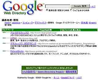 何故なら、WEBページを分類しているGoogleWeb Directoryを眺めてみると、わがhirax.netはちゃんと「World> Japanese > コンピュータ > グラフィックス > 画像処理・開発」 に分類されているのである。そもそも「エロ」という分類がGoogleWeb Directoryには見当たらないような気もするのではあるが、そんなことはどうでも良いのだ。やはりGoogleは「できるかな?」を「画像形成技術に関するエトセトラ」だと判ってくれていたのである。