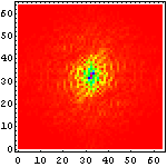 次に、それぞれの文字画像の複雑さの特徴を眺めるために、それぞれ二次元フーリエ変換をかけて、周波数空間に変換してみたものを示してみることにしよう。まずは、漢字の例を示して図の見方を説明してみたい。