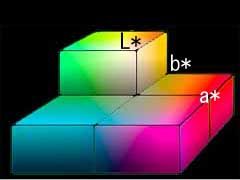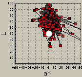 最後に、上の結果を大雑把ではあるがL*a*b*空間に配置してみたのが下の結果である。むちゃくちゃなやり方ではあるが、色空間の中で「エロ・童話・心・笑顔」といった抽象的なものの色が配置され、それぞれの色が何色であるかが判ると思う。「心」が「童話」と「エロ」の間に位置するなんて、何か意味深な気もするし、「エロ」と「笑顔」が結構離れているなんて、なんか笑っちゃう話のような気もするけれど、そういう想像は各人それぞれがする方が、きっと面白いに違いない。