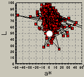 また、(L*a*平面)で「エロ・童話・心・笑顔に伴うイメージ」の色分布を眺めてみたのが下のグラフである。見事なくらい「エロ」には青とか緑が含まれていなくて、暗からず明るからずといった明るさの色が多くて、ということが判ると思う。また、童話が比較的明るいみどり辺りに集中していたり、「心」はやっぱり広い色分布なんだ、ということが判るのである。