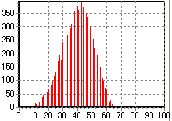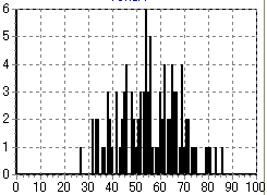 そんなわけで、下に示すのが「何回目でビンゴになるか一万回試行したときのモンテカルロシミュレーションを行ってみた結果」である。実際にビンゴ大会を一万回したらものスゴイ時間がかかるが、PCの中だったら一瞬ですむのが素晴らしいところである。ちなみに、ビンゴのシートの条件は、シートに書かれている数字が