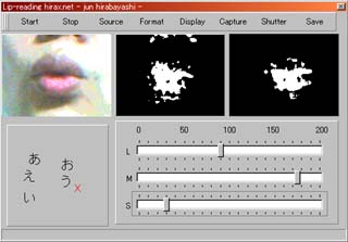 そこで、ビデオカメラの画面の中から唇の形を検出して、何を喋っているのか、何を喋ろうとしているのかをリアルタイムに検出する読唇術ソフトウェアを作ってみた。とはいえ、一晩で作ったソフトだから、たった五文字の母音を検出できるだけだ。SPEAKINGMOUTHで眺めた「唇の動き」と自分の唇の動きを参考にして、相手の唇の動きから「五文字の母音」つまりア・イ・ウ・エ・オを読みとるだけだ。子音の判定は難しいけれど、日本語のように必ず母音を伴う言葉であれば、どの母音かが判るだけでも、相手の言葉を想像するためのとても大きな手がかりになるだろう。