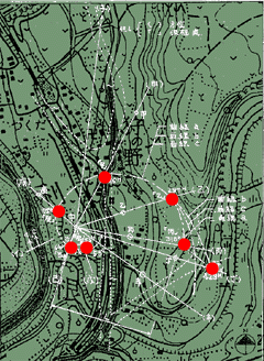 さて、この埋蔵金ミステリーで指し示された「埋蔵金の埋まっている七つの古井戸」がどこであるかを知りたい人も多いだろう。ということで、特許の図を重ね合わせ、埋蔵金の埋まっている七つの古井戸の場所をプロットしてみたのが、次の図である。どの辺りか判らない人のために、広域地図をリンクしておくとここら辺りということになる。