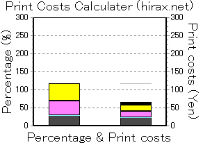 というわけで、「プリント・お値段鑑定団」ソフトウェアというものを作ってみた。これは、画像ファイルを読み込んで、その画像を出力したときに、どの位インクを使うかを調べ、それを出力した時の大体の値段を計算してくれるものなのである。例えば、PowerPointからTIFFファイルに印刷結果を出力するTIFFプリントドライバーや、Bitmapファイルに印刷結果を出力するBitmapプリントドライバー、あるいは、PDFプリントドライバー+PDF2BMPのようなもので、前もって印刷画像を画像ファイルにしてみて、それを読み込んで、カタログに記載されているインクや紙の値段を設定すれば、「これを印刷するとお勘定はこの位になります」と教えてくれるわけなのである。