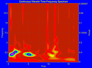 というわけで、下に示すグラフは横軸が約15秒間の時間を示している。そして、縦軸は生じている振動の周波数を示し、色はその周波数の信号の強度を示している。つまり、時間をおってどんな周期の振動が生じているかを示したグラフなのである。