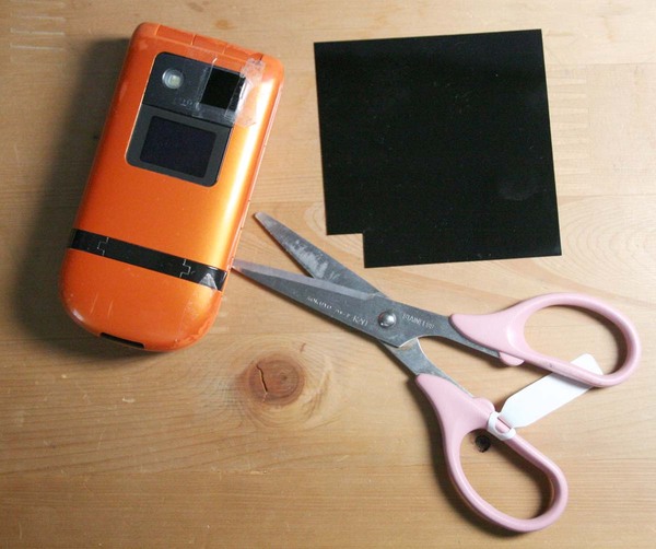 そこで、ケータイに付いているカメラのレンズ前に「赤外線を通し、可視光をカットするフィルタ」を付ければ、赤外線で見る世界をケータイのカメラを通して眺めることができる「赤外線カメラ付きケータイ」に変身するわけです。というわけで、右の2枚の写真が、「改造前の”ノーマル”ケータイ」と、レンズ前に820nm以下の光を通さないフィルタを(入手方法)セロハンテープで貼り付けることで「赤外線カメラ」に改造したケータイになります。ケータイですから、もちろん、持ち歩くのもとても簡単です。しかも、片開きドアのように「可視光カットフィルタ」を取り付けておけば、普通の可視光写真を撮るモードと赤外線写真を撮るモードを切り替えるのも簡単です。