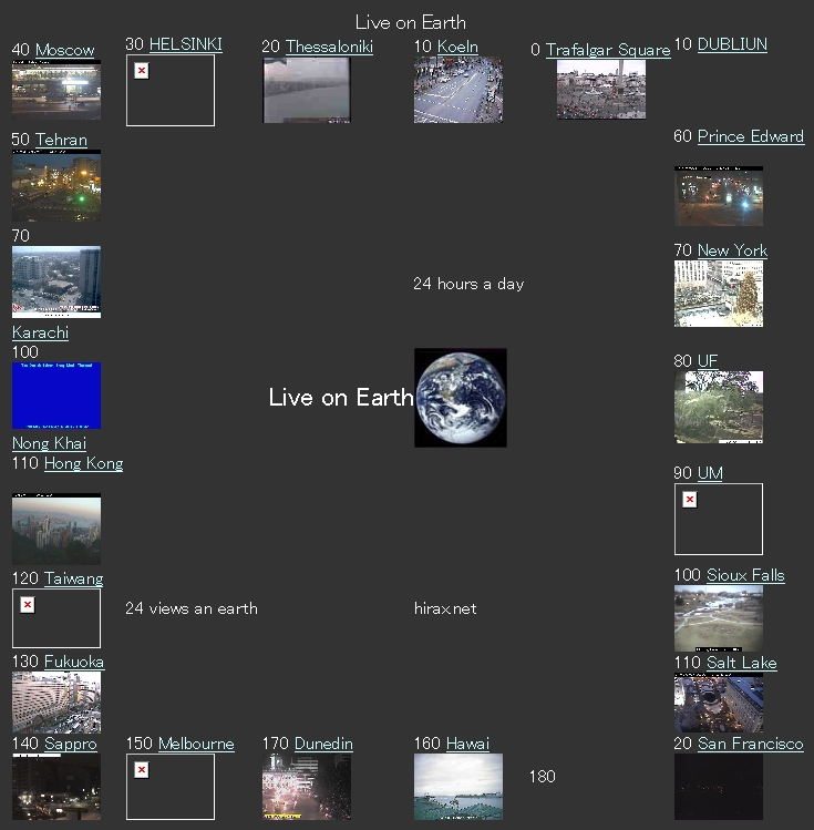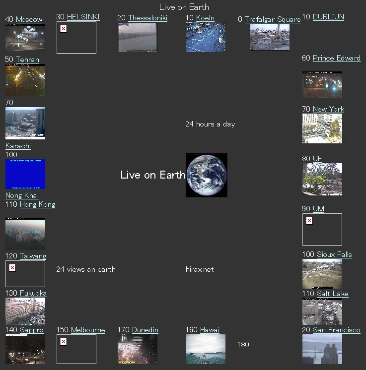 日本時間9:50。札幌では雪が吹雪いて少し薄暗い一日が始まったようです。香港やカラチでは元旦の朝が明けていくところ。その先の国では、まだ大晦日から元旦にかけての夜の中のようです。地球が回って、太陽が東から西へ地球を照らしていくようすがわかります。2005年の始まりです。
