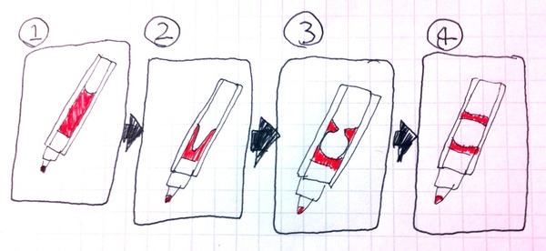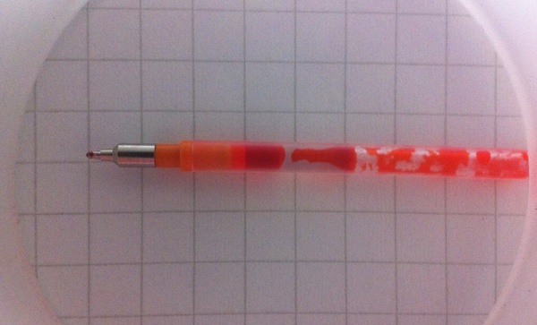 ボールペンを使っていると、(たとえば、右の写真のように)芯のインク中に空気が入ってしまい「まだインクがあるのに、字が書けなくなっちゃったよ〜」ということが起きたりします。