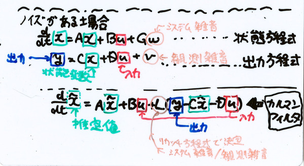本屋で理工系の棚を眺めてみると、制御工学の書籍がたくさん出版されている。その半分くらいは「Matlabによる○×制御工学」というような感じだ。手にとってみると、数式が滝のように流れていて、難しくて話の流れを終えない。最後は結局Matlabコマンド一発で済ませるなら、数式追いかけたくないような…流し読みしたいような…と考えて、ふとわれに返りカナシイ気分になりながら、「(いかにも)微分方程式」から「カルマンフィルタ」までのラクガキを下敷きに描く。