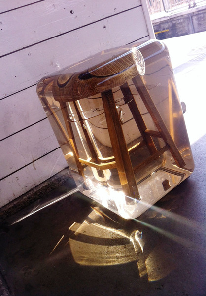 丸椅子を封じ込めた堅牢な透明樹脂、「触れない椅子」に太陽の光が当たれば、まるで大きなプリズムのように、白色光を細かく分け・駅舎を七色に輝やかせます。七色の光子を放つプリズムの上に座り、ホームに走り来る列車を眺めていれば、理系心と鉄心の両方が100パーセント満たされます。