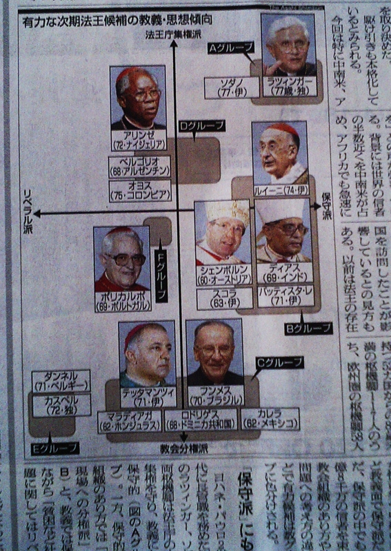 朝日新聞の朝刊から「次期法王候補の教義・思想傾向」を示した散布図。最近、こういう「解説用の各種チャート」が紙面に頻出するようになってとても楽しい。楽しいだけじゃなくて、もちろんわかりやすい。