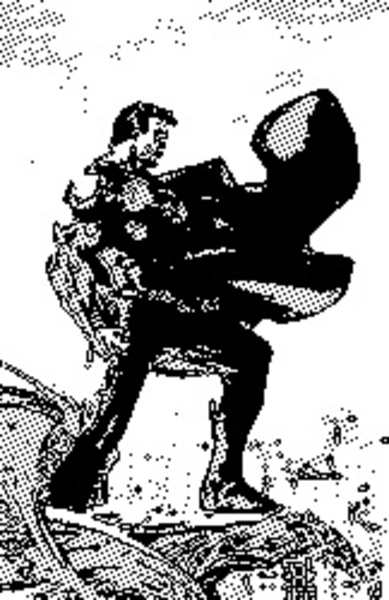 ちなみに、「スーパーマンの画像をマンガ風に描いた画像変換を掛ける(=apply dog vision to image of superman)」と右の画像のようになります。これは、フルカラーの階調画像を二値的にハーフトーニング(中間調処理)する、つまり、人間や動物ならぬ機械の出力特性に沿った(非常に大雑把な)変換画像を作る機能です。