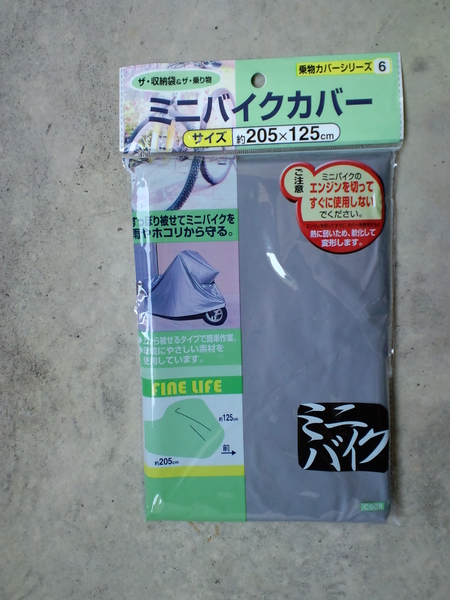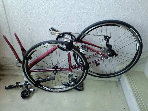 自転車の前輪だけを外し、ひっくり返した状態で、マジックテープでフレームに固定して、その上からは「バイク・スクーター用カバー」をかぶせ、「面ファスナ」でカバーと自転車を固定する、という具合です。自転車の持ち方は、カバー上部に空けた穴から「フレームを掴む」というだけの実に雑な代物です。乗客があまりいない列車で、ゆったり移動する時にしか使えそうがありません。また、(「バイク・スクーター用カバー」のビニールが薄いために)耐久性が極めて低いので、「輪行袋」を使うたびに1回200円の追加投資をして「輪行袋」を作る必要がありそうです。