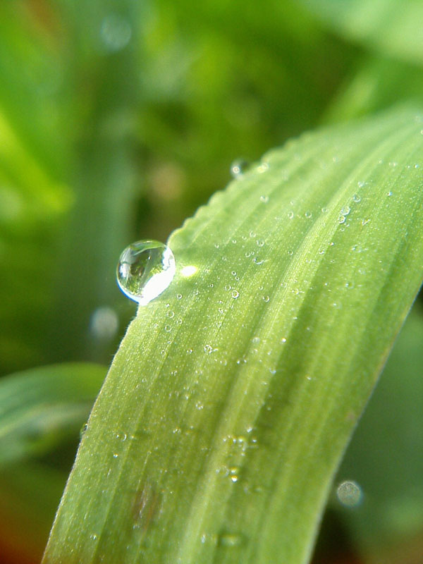 朝早くの駐車場。芝生の中でじっと屈んで撮ってみる。水滴は小さな小さな魚眼レンズになる。カメラ付きの携帯電話で、水滴を眺めると、水滴でできた魚眼レンズの向こうにはさらに世界が広がっている。