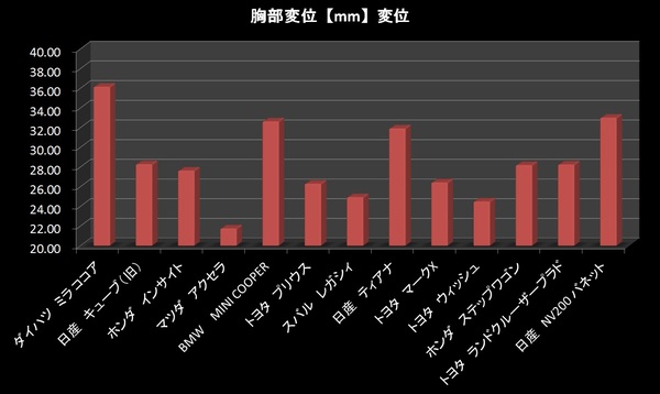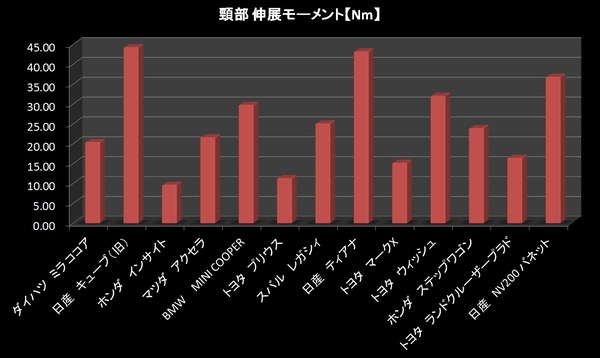 ちなみに、下に示した「胸部変位【mm】」も「頸部 伸展モーメント【Nm】」も、数値が小さい方が「乗員へのショックが小さい」ということになります。
