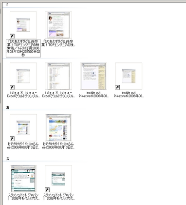 WEBページの内容はSJISで変換してありますから、後でWindowsの検索機能やらGoogle Desktopやらの適当な手段で検索をかけてやれば、眺めたページの検索が簡単にできるはず、というわけです。 また、インターネットショートカットにはサムネイル画像も付けられているので、イメージ的な検索も(現時点では)人力検索で、直感的にできるかもしれません。