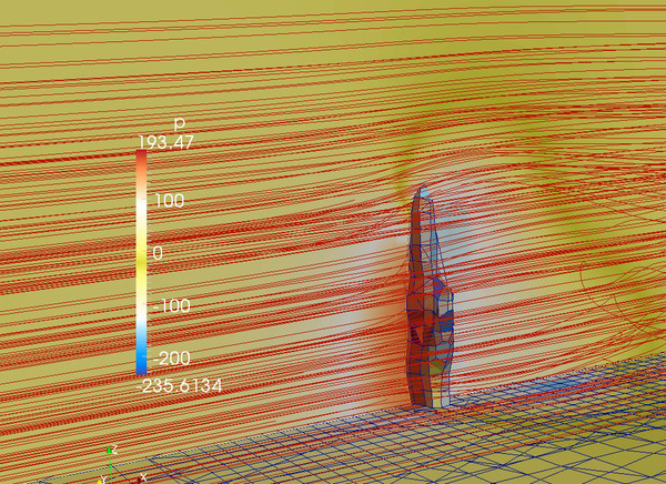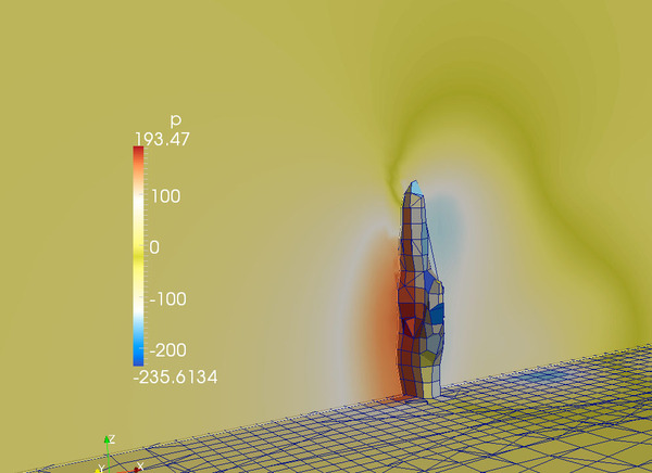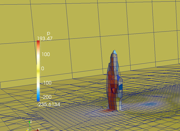 空気流の圧力を表示してみた結果(たとえば左の画像)を眺めれば、掌の前後にはおよそ300パスカルの圧力差があることがわかります。時速60kmの風速を計算するつもりが間違えて時速70kmで行っていたことを考えれば、(これを時速60kmの時に換算すると)ざっくり300パスカル × (時速60km/時速72km ≒ 250パスカル というところでしょうか。