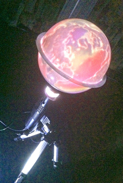 (昨年Maker Faire Tokyo 2014 で眺めた湯村さんのPersonal Cosmosが面白く・ハマったたので)神田無線電機モバイルプロジェクタとスマホ魚眼レンズで全球ディスプレイを作ってみよう!?(第1回) …というわけで、湯村さん@yumu19のPersonal Cosmosモドキを仕立ててみました。1万円ちょっとで買った神田無線電機のモバイルプロジェクタと東急ハンズとダイソーで買った300円くらいの小物と、家に転がっていたいくつかのレンズの組み合わせで作ってみた超個人的な「全球儀」です。ほぼ球面上の地球表面や上空に流れる流体の動きや、太陽からの放射熱や熱放出のバランスで決まる温度分布をグリグリ眺めてみると、何だかとても楽しく思えます。