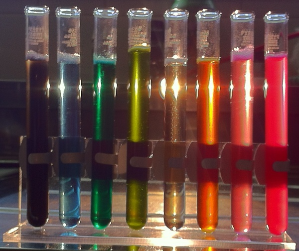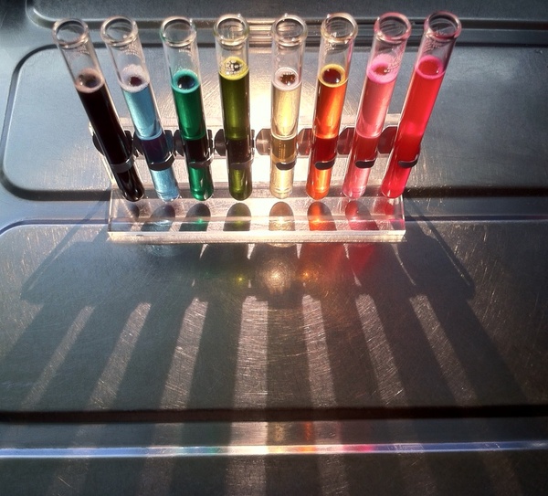 まずは、製菓に行き(手に入る限りの)すべての食用着色料を買ってきます。そして次は、酒屋に行き発泡酒(着色料が思ったより高く、研究予算が尽きたのです)を買いました。そして、試験管に「黄色いビール(本当は発泡酒…以下省略)+着色料」を注ぎ込み、ビールの泡が消えてしまうことも恐れずに・ひたすらビールと着色料をかき混ぜます。そういう風に、世界各国にあるだろう「色んな色のビール」を作ってみたのが下の写真、まさに虹色/7色のビールです。