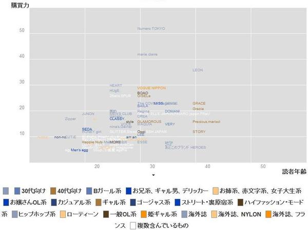 「着回し」という言葉を含む雑誌が、右下の方に分布していることが一目でわかると思います。この図を一言で言い表せば、「着回し」を気にする読者はファッション購買額が全体平均より低い・・・という風になるように思えます。逆に家は、ファッション購買額が全体平均より高い読者層の雑誌には、「着回し」の記事など載っていないのです。