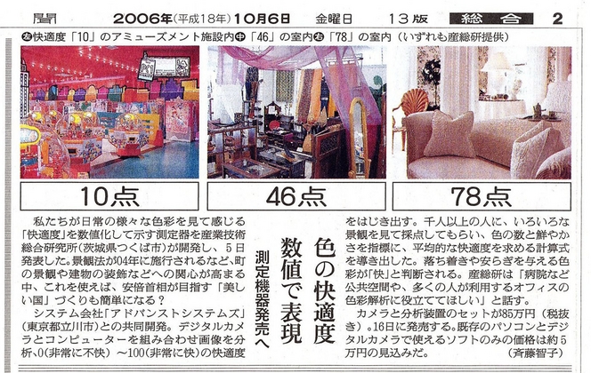 「色彩に対する人間の心理特性に基づき、色彩環境の色彩快適度を計測する」というカーラーコンフォートメータ。産業技術総合研究所とアドバンストシステムズ株式会社によるもの。産業技術総合研究所のプレスリリースを見る限り、アルゴリズムは「同系色が多いほど、快適。彩度が低いほど、快適」という具合。