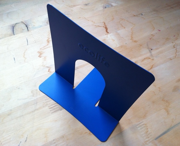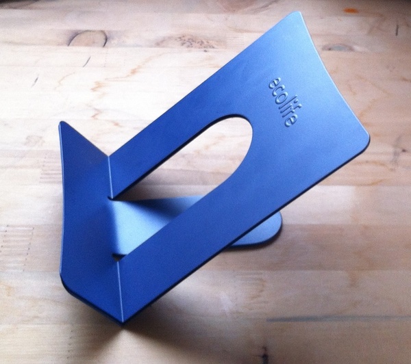作り方はとっても簡単です。まずは100円ショップに行って2個セットで100円ナリのブックスタンドを買います。そして、買ったブックスタンドを机の上に重ねて置いたところで、エイヤっと力をかけて勢いにまかせて曲げてみます。すると、それだけで「お手軽ノートPCスタンド」ができあがり、です(右下写真が折ったブックスタンドが2つ重なっている写真です)。