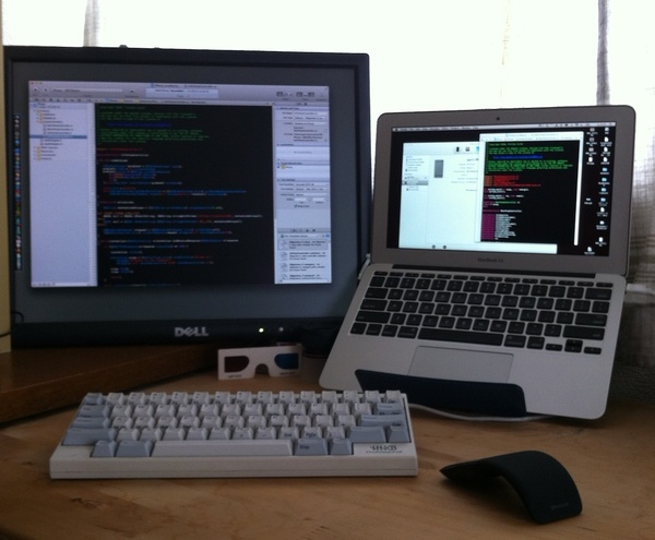 (構造上の強度不足を補うために)2つ重ねたブックスタンド上にノートパソコンを置いて、外付けキーボードやマウスを繋ぐと、なかなかに心地良いデスクトップ・コンピュータ環境ができあがります。…何だか「オシャレ」ではないような気もしますが、そんな見た目にこだわらない人にはお勧めかもしれません。…「見た目」も意外と重要ですけれど、ね。