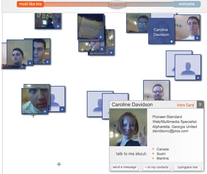 はてなダイアリの「おとなりページ」の波が一段落した今日この頃、introというページを知る。これは、あなたの「おとなり人間」を見つけ出すことのできるツール。「あなた自身がどんな人間か」をメニューで選べば、あとはあなたに似た「おとなり人間」を見つけ出してくれるツール。